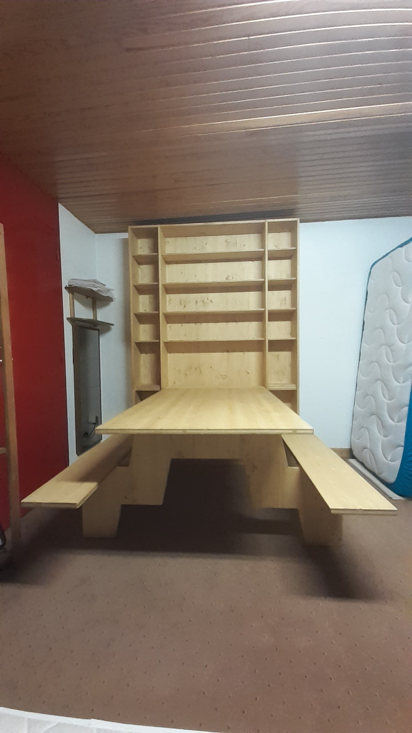 - table escamotable 150x95x75 avec 2 bancs intégrés pour 5/6 personnes